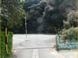 道路には柵が設けられていました。右側の白い説明板には、「ご参拝者の方へ、柵を開け、ご自由にお入りください、お帰りの際、柵は閉じてください、八王子神社」とあります。