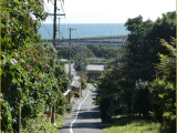 坂下の突当り丁字路が先の右折地点その2です。眼下には太平洋も窺えます。ガイドは丁字路交差点まで歩きUターンして、今度は坂を上ります。これで、どちらが旧道でもOK。