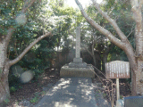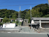 参道右手前に社碑があり、参道の左側は境内の空き地と成っています。参道の先には石段があり、石段を上ると石灯籠一対と石鳥居が有ります。