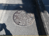 68)武者絵マンホール:交差点の先、左側歩道、道路西側