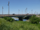 街路灯が独特の形をしています。橋の中央、右側歩道には、お祭りタイルが貼られています。