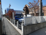 此処には手前から順に、狸八相縁起説明板、狸の置物、古くて頭の丸い一里塚之趾道標、一里塚の由来石板、新しい史跡東海道草薙一里塚石碑が有ります。