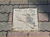 市の鳥、カワセミが描かれたタイルが右側歩道に貼られています。