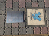 車道側に富士山と安倍川?、構造物(船?)が描かれたカラフルな消火栓が有ります。
