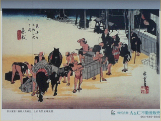 広重の版画には、荷物を載せ換える人馬の姿が描かれています。荷物は現在の様に、通しでは運べなかったのです。
