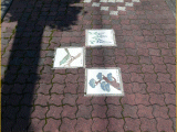 7)三枚のタイル:旧道に戻り直進交差点を直進すると、右側歩道、徒歩16分、道路北側