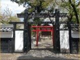 黒い冠木門の先には赤い鳥居が、その先には拝殿が窺えます。拝殿の左には、大岡稲荷社の説明板が有ります。陣屋跡と神社は同じ敷地内に在ります。