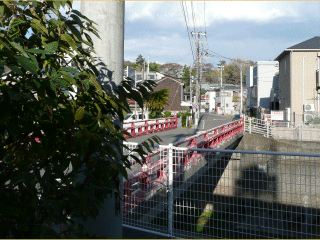 写真の赤い橋が大鋸橋で、その橋の先には遊行寺が在ります。大鋸はこの辺りの地名で、大鋸引(おおがびき)職人が住んでいたことから名付けられました。