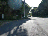 この交差点は変形五差路となっており、交差点の左奥に左から順に、道標、杭、説明板が在ります。この先は県道413号線との合流地点です。