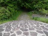 箱根八里記念碑からは高い杉が生えた杉の葉だらけの石畳を歩き、右手から旧国道が合流します。昔は右手に宴会場(四季遊山)が在りました。