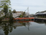 右側歩道には時計台が、左側歩道の先には石段と和風建築(御殿)が窺えます。此処で道は右側に折れます。写真右側は三の丸広場です。今日は花見客が押寄せていました。