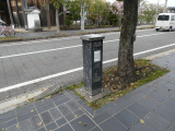 右側歩道の車道側に古そうな金属製のポストが有ります。
