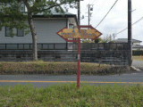 奇抜なデザインをした赤い道標です。掛川市境まで1.0km、磐田市境まで6.0km。駿河は広大です。