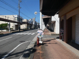 旧道はここを直進します。旧道の左手には、東町ふれあい広場が在ります。また右側歩道の手前には、とびだし注意!の看板(飛び出し坊や)が二つ置かれていました。