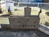 16)金属製の立札とここは東町4丁目看板/東町ふれあい広場:寺を罷り旧道に戻ると、左手、広場左手前、徒歩14分、道路南側