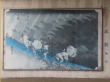 国道25号線下ガードの左右壁面に片側4枚づつ、計8枚の版画等が貼られています。左側手前から庄野(白雨)、亀山(雪晴)、関(本陣早立)、坂之下(筆捨山頂)、