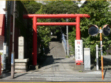 赤い鳥居の左側には大綱大神金(刀+比)羅宮鎮座石碑が、右側には神奈川宿歴史の道、大綱金刀比羅神社と一里塚説明板が有ります。