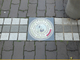 絵が描かれたタイルが歩道に埋められています。日本橋31km、鶴見、神奈川、西、保土ヶ谷、戸塚、とあります。