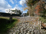 左から車道が合流します。交差点右手前には、島田市指定史跡、「東海道」金谷坂の石畳高札などが在ります。写真からも、石畳に使用されている石がかなり丸い事が分かります。
