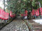 旧道の左右に「奉納 すべらず地蔵尊」と記された赤い幟が立並びます。右手には新たに休憩場所が新設されていました。