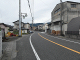 道路の左側には行灯が2個ぶら下がる街路灯が続いています。またこの辺り、旧道はS字カーブを描いています。