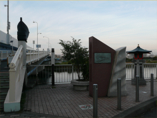 此処には厄除川崎大師の石灯籠、明治天皇六郷渡御碑、長十郎梨のふるさとの看板と、渡船のモニュメントが有ります。また広重の版画には、六郷(六合)の渡しが描かれています。