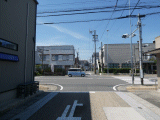 交差点右奥に↑↓東海道道標が有ります。写真右側に写る横断歩道を使用して、県道を横断します。