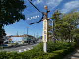 歩道の左側(車道側)に、同道標が置かれています。支柱には海と関所のまち湖西市、とあります。