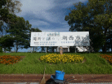 43)ようこそ関所と湖の町・湖西市へ看板:モニュメントの先、歩道右手、徒歩176分、道路北側