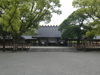 広重の版画には熱田神宮の神事、駈馬(かけうま)が描かれています。写真は熱田神宮の拝殿を写しています。