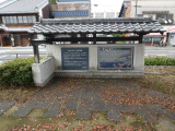 瓦塀の裏には左に七里の渡し舟着場跡説明板が、右に浮世絵が貼られています。説明板の説明文は、江戸時代東海道の宿駅であった熱田は「宮」とも呼ばれ、桑名までの海路「七里の渡し」の舟着場としても栄えていました。