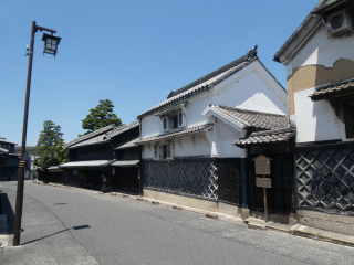 広重の版画には、鳴海絞を売る店と旅人達が描かれています。写真は有松に在る、服部家住宅を写しています。