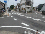 写真の横断歩道を使って、県道の右側歩道に出ます。横断歩道を渡ると、右側歩道には東海道一里塚タイルが貼られています。