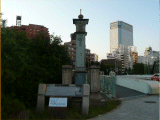 橋を渡り終えると、右手には立派な親柱が建っています。写真は橋の出口側から撮っています。此処から車道と分かれて、空中公園の中を歩きます。