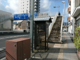 小田原では電話ボックスにも瓦屋根が付いています。歩道橋の後ろには東海道線のガードも覗えます。