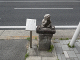 石像では旅人が笠と草鞋を脱ぎ、足を洗っており、胴には旅篭屋の文字も彫られています。また説明文には、