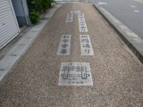 中央に岡崎城下二十七曲り 総門通り ↑籠田惣門 ↓東本陣、とあり、その両側、手前と奥には、冠木門と旅人二人が描かれた岡崎城下二十七曲りイラスト(写真手前)が描かれています。