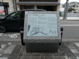 この案内板も更新されています。以前は岡崎宿二十七曲り案内板でした。案内板の左下には周辺図が、右下には連尺商人と旅人の浮世絵が描かれています。上部の説明文には、