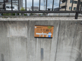 右側、道路の擁壁に、同ステッカーが貼られています。この案内板は旧道の歩き方を説明しています。三清橋を渡り、〇(〇+わ)地点で左折、です。