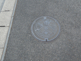 マンホールの蓋には、日の丸の扇二つと鼓が描かれています。この日の丸の扇は家紋にも成っています。但しこちらの方は日の丸ではなく、月丸です。(笑)
