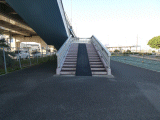 歩道橋で、地上と高架/R419の中間の高さを通って向いに行きます。入口から階段を上り、次いで左にUターンします。