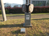 石の台座の上に銅製の3枚の花弁が形成されており、手前の花弁には猫が、奥のそれには犬が、裏のそれには馬?、狐?が描かれています。台座には、鎌倉街道のパネルが貼られています。パネルの上部には2枚の写真が貼られており、