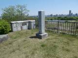 石碑の手前にはベンチも置かれています。石碑の右側面には、同説明板の説明文に記されている様な文章が彫られています。また説明板の表面には風化によって、多数のヒビが入っていました。説明文には、