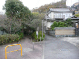 旧橋の右手には車止と二本の路地が有ります。路地の叉には梵字が記された杭が有ります。左の路地は旧梅川跡の様です。