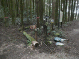 登山用道標はかなり傷んでいますが、3本の腕を持っています。左奥方向を指す腕には←田村神社跡10m、鏡岩150m、とあります。