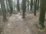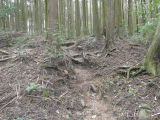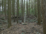 此処を左折します。正面木の裏側の白い物体は、鏡岩←(赤い矢印)と記された地面に置かれた道標です。(気配りが足りません、笑)