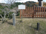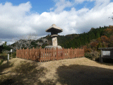 旧道右手に同案内板と、木製の柵の中に大きな灯籠が建っています。案内板の右側には説明文が、左側には風化した周辺図と、その下に鈴鹿峠←→4.3km、山女原←→2.1km、かもしか高原←→1.1km、安楽越、とあります。説明文には、