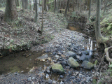濡れない様にして、短い小川を渡ります。上り階段の先には蟹塚の境内/石柵も見えています。