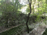 旧道の左手には石垣が積まれています。説明板に有った、古町跡でしょう。写真右側には、堀を渡る小橋も見えています。
