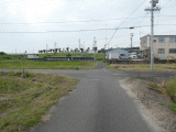 迂回路は此処を直進します。正面に見える高架道路は県道です。
